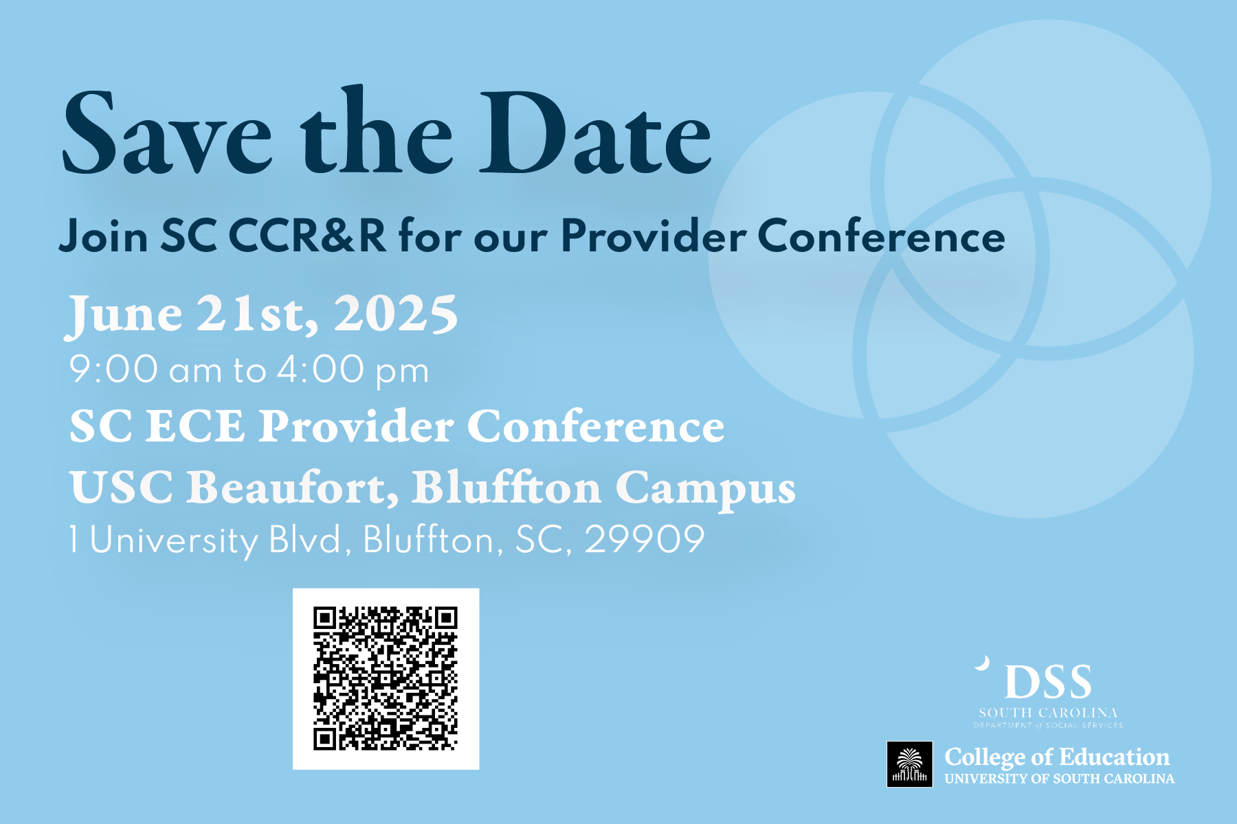 The SC CCR&R Early Care and Education Provider Conference is an excellent opportunity for providers to receive up to five training credits including social emotional, nutrition, and physical activity. There will also be a keynote panel discussion on South Carolina's evolving ECE regulations, as well as giveaways, and free lunch.
